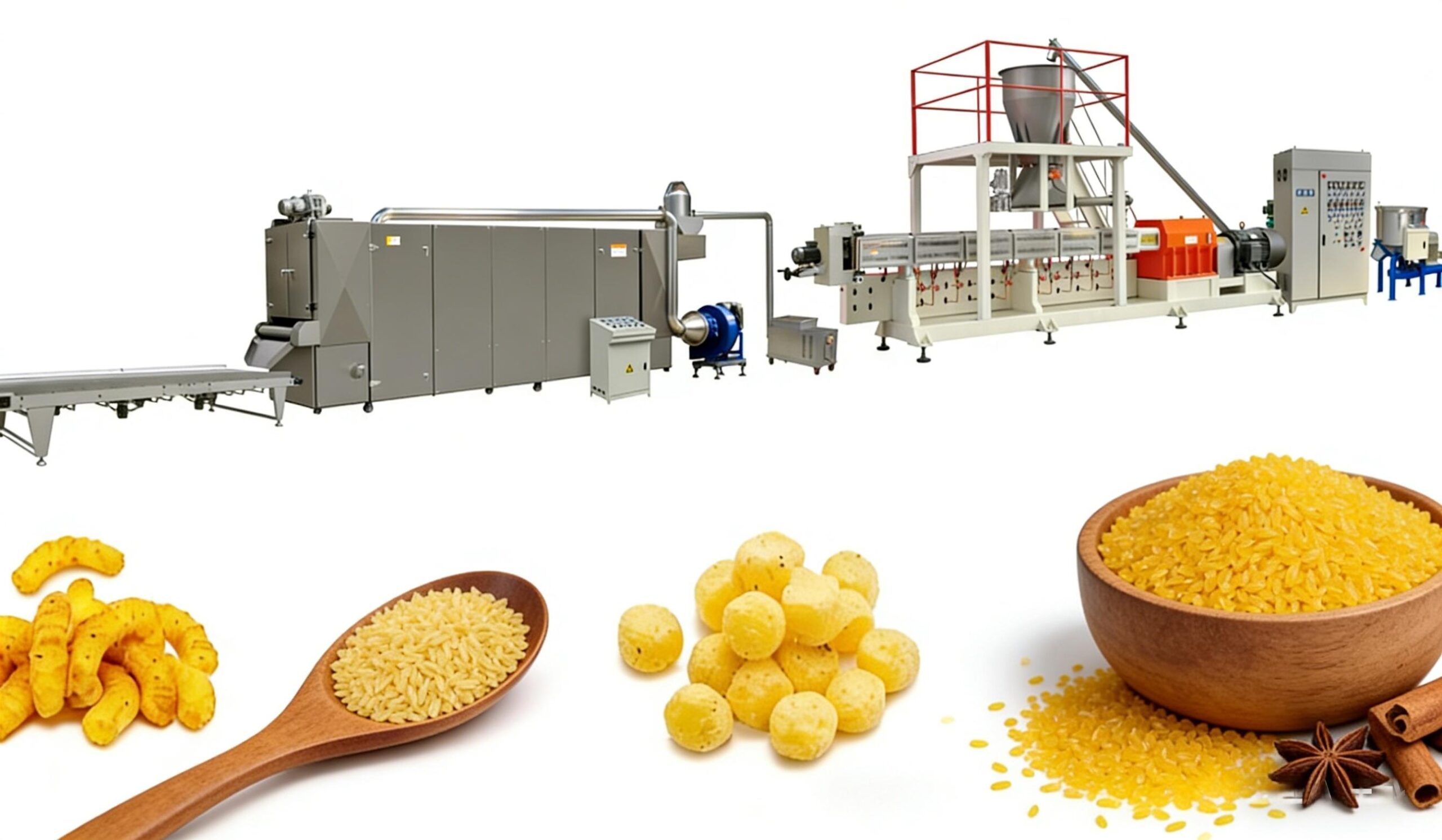 The fortified rice production line typically includes raw materials mixing, elevator, feeding, extruding, molding / cutting, and drying, seasoning, cooling and packaging processes. And our automatic corn snack processing line ensures a continuous and efficient workflow.
